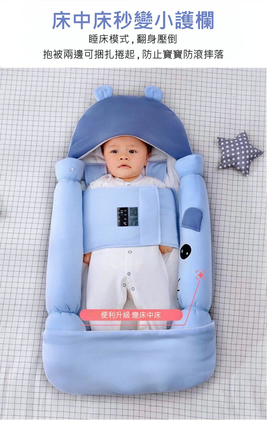 まるでお母さんの腕の中にいるような、安らかな眠りを赤ちゃんに。この「ベッドインベッドおくるみブランケット」は、乳幼児向けに特別に設計されており、ベビーベッドからベビーカーまで、あらゆる場面で活躍します。両面に厚みのあるガードレールが付いているので、赤ちゃんが寝返りして押しつぶされたり、驚いて目を覚ましたりするのを効果的に防ぎ、よりぐっすり眠ることができます。驚かないようにする構造が、夜中の驚きを軽減し、深い眠りを長く保ちます。厳選されたA級純綿を使用し、柔らかく通気性に優れ、一年中快適にお使いいただけます。目に見える温度センサーで、赤ちゃんの快適度を簡単に確認できます。外出時はベビーカーに取り付けるだけで、風よけと保温性を高め、家でも外でも安心です。可愛らしいデザインとサイズが豊富。新生児から大人まで、赤ちゃんと寄り添います。新米パパママのマストアイテムとして、またギフトや自分へのご褒美にも最適です。